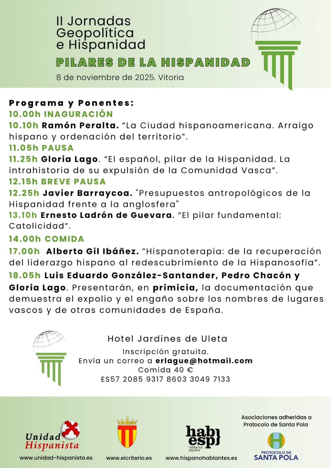 -Todos- Alex Borrás (10) Alfonso Ussía (1) Amalio de Marichalar (25) Antonio Bosch (1) Antonio Nadal (13) Berta Romera (8) Carlos de Palma (251) Carlos Pérez-Ariza (57) Carmelo Fernández Millán (2) Carmen Cordón (1) Carmen Obregón (1) Damián Carmona (16) Elena Ramallo (6) Enrique Sánchez Motos (7) Erik Encinas (1) Ernesto Ladrón de Guevara (1) eventos (5) Fernando Jiménez Sánchez (1) Ferran Brunet (12) Filomena López (45) Francisco Pajuelo Trejo (86) General Dávila (5) Ginés Ladrón de Guevara (8) Javier Megino (1) Jesús Cacho (1) Joaquín Ramírez (1) José Ramón Riera (20) José Ángel Cobo Ruiz de Aldana (3) Juan Antonio de Castro (4) Juan Antonio Molina (3) Juan Carlos Martín Torrijos (19) Juan Carlos Tellería (6) Juan Francisco Alcaraz (92) Juan Manuel Jiménez Muñoz (7) Julio Serrano (1) Manuel Garrido (47) Manuel Jesús Pérez Lorenzo (2) Manuel Quiterio Mahugo (1) Marcelo Gullo (7) Miguel Zunzunegi (1) Patricio Lons (5) Pedro Toledo (1) Pilar Almagro (3) Santiago Álvarez Barón (3) Álvaro Cordón (12) Ángel Liberal Fernández (1) Ángel Mazo da Pena (1)II Jornadas Geopolítica e HispanidadPilares de la Hispanidad...![]() Fecha: 08-11-2025 |