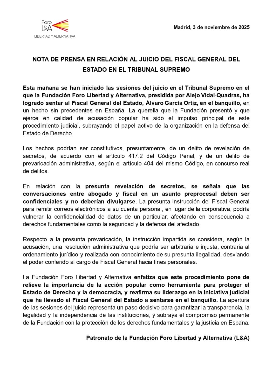 Nota de prensa en relación al juicio del Fiscal General del Estado en el Tribunal Supremo